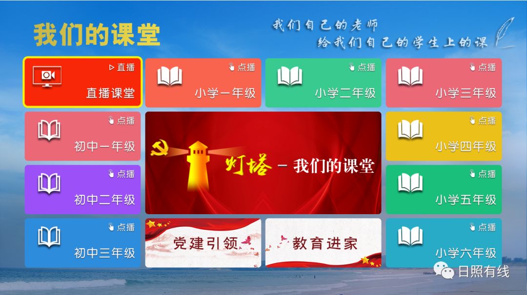 为做好延期开学期间全市中小学远程学习教育服务工作,自2月10日起,日照市正式开始线上教育服务工作。日照市教育局统筹全市优质师资力量,制作课程资源,供各区县、学校在延期开学期间使用。日照有线发挥自身资源优势,开通了12套电视直播教学频道,播放学习内容从小学一年级到高中三年级,涵盖了小学、初中、高中不同学阶的课程。
