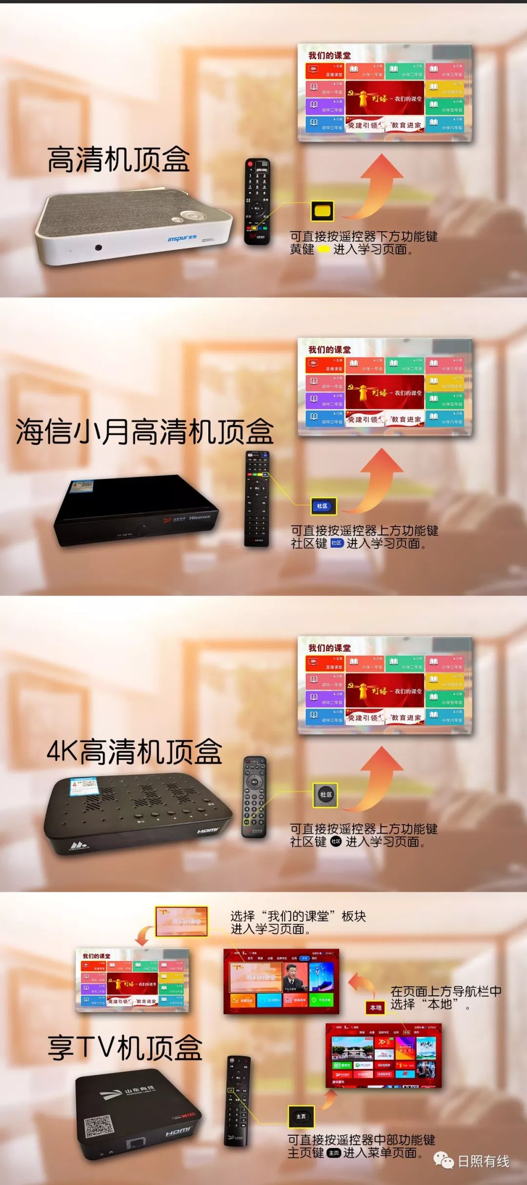 高清机顶盒、享TV机顶盒将在第11频道导视频道,采取全天24小时轮动播出的方式,直播播放教学内容。