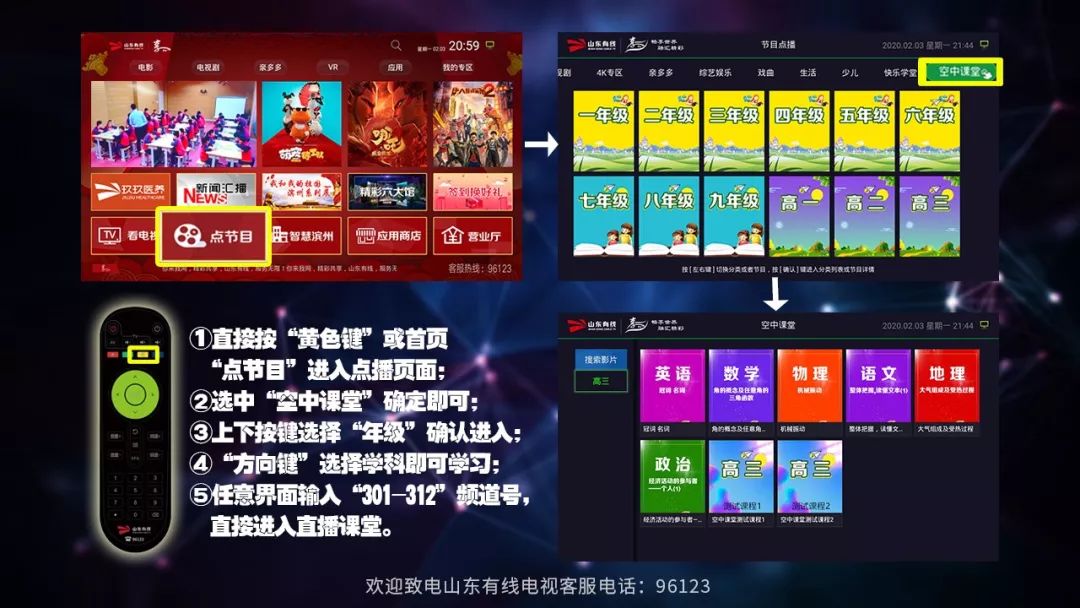 学生可通过有线机顶盒301-312频道(每个频道为一个年级,依次为小学一年级至高中三年级)进行“空中课堂”直播收看,按需选择频道进行学习。