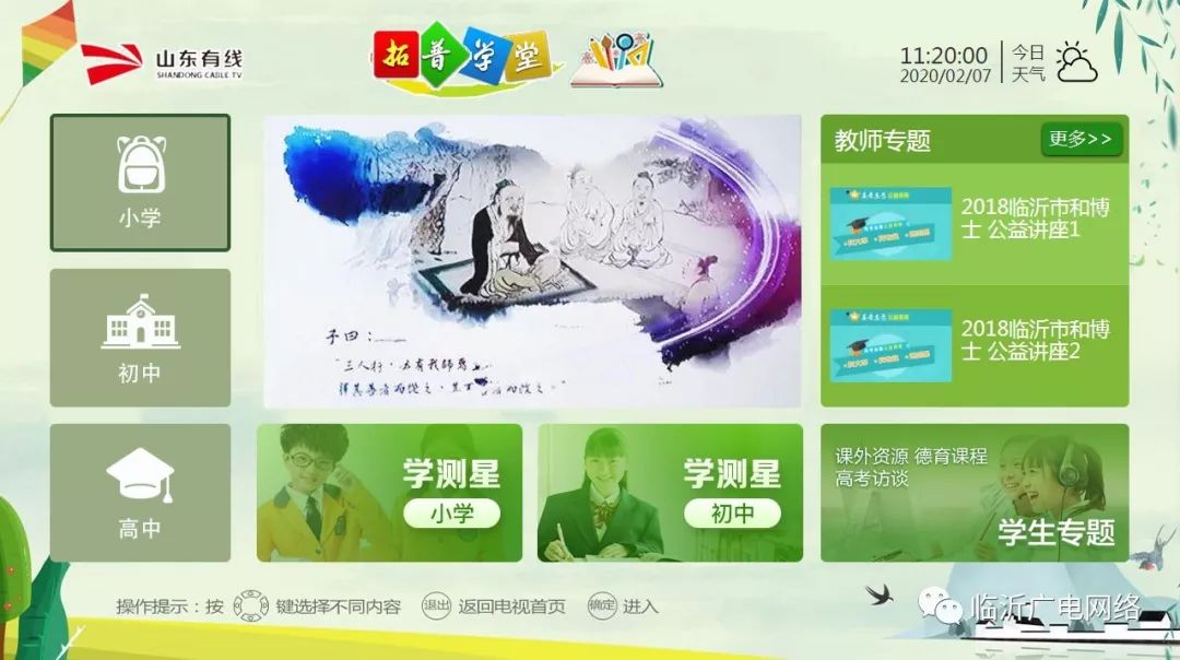 ●享TV用户进入首界面的“临沂”菜单,选择“拓普学堂”版块。