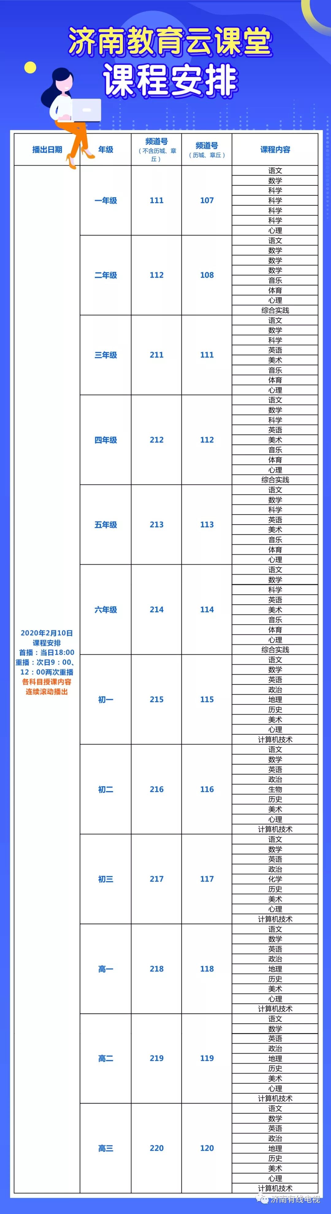 ●济南有线直播频道(不含历城区、章丘区):111、112频道,211—220频道,播放小学、初中、高中12个年级的教学内容。