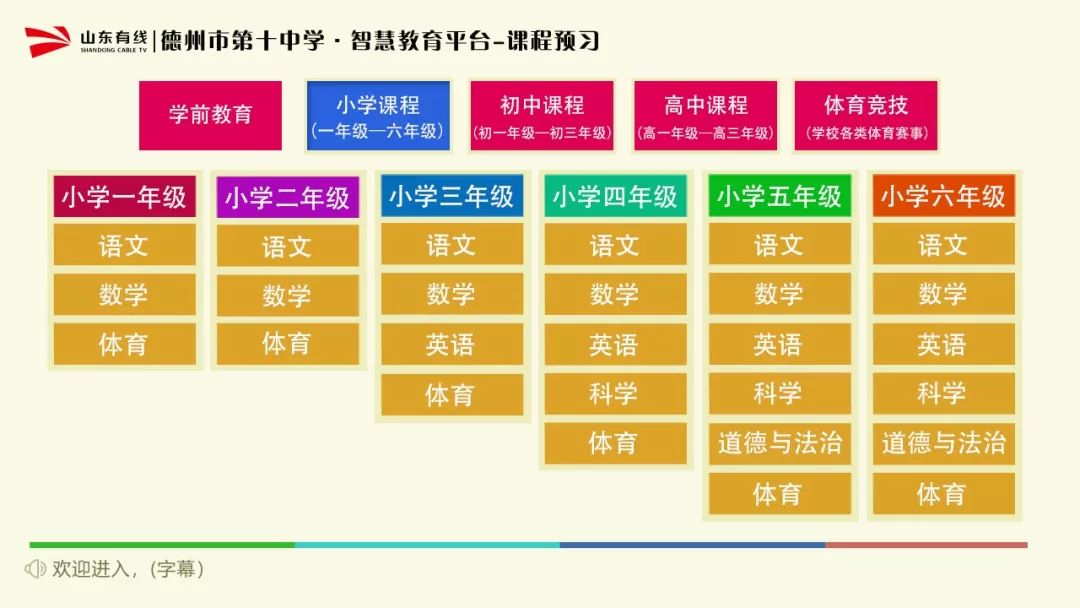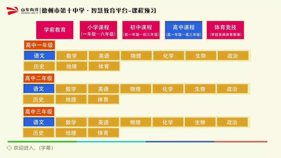 青岛有线在线教育课程范围涵盖小学1-6年级、初中1-3年级、高中1-3年级,包括语文、数学、英语、物理、化学、生物、政治、历史、地理、音乐、美术共11个科目。