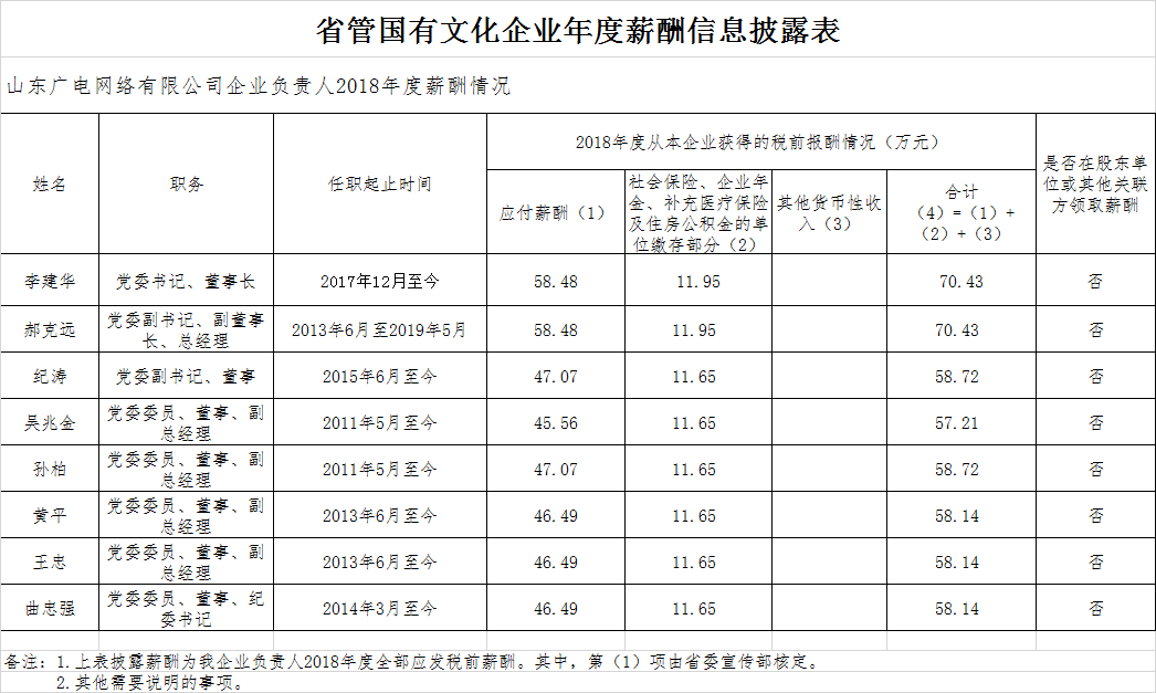 山东广电网络有限公司企业负责人2018年度薪酬情况