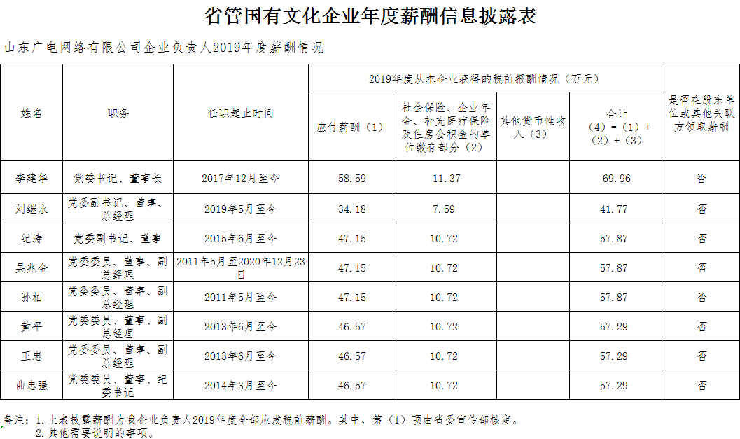 山东广电网络有限公司企业负责人2019年度薪酬情况